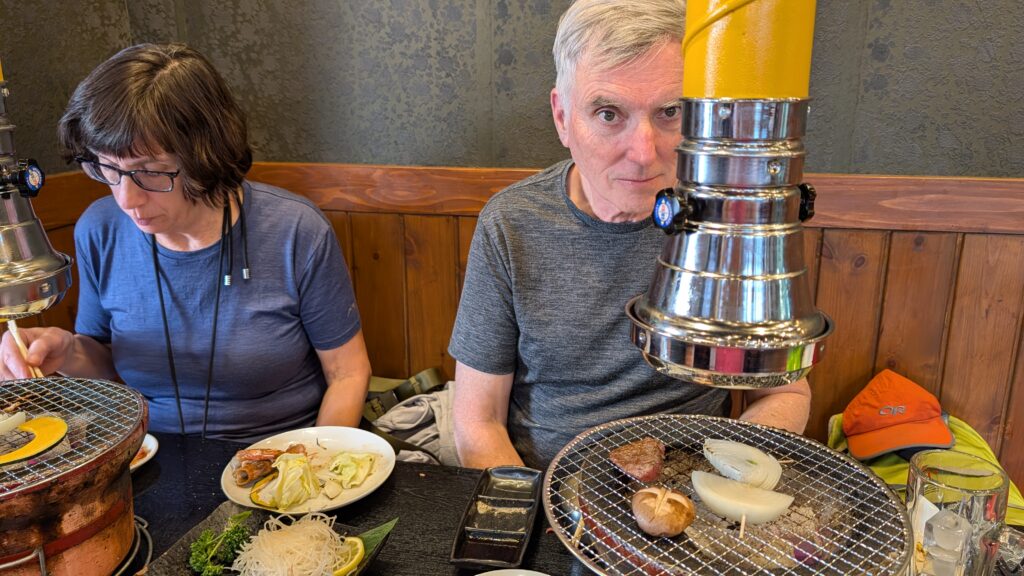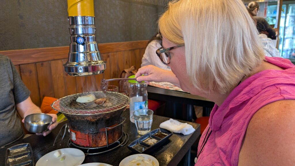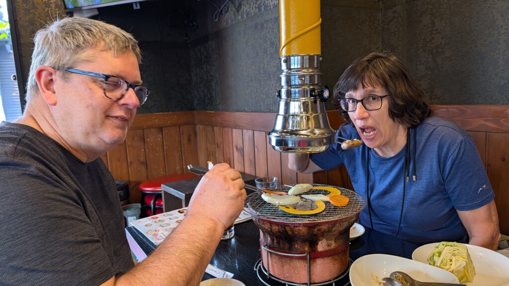 We had lunch at a Japanese barbecue. This time instead of a bowl full of boiling soup we got a little grill. We had to order everything this time, so we didn’t have as many vegetables which was disappointing. We ordered little tiny bits of steak and Kristine had shrimp. It was delicious!.