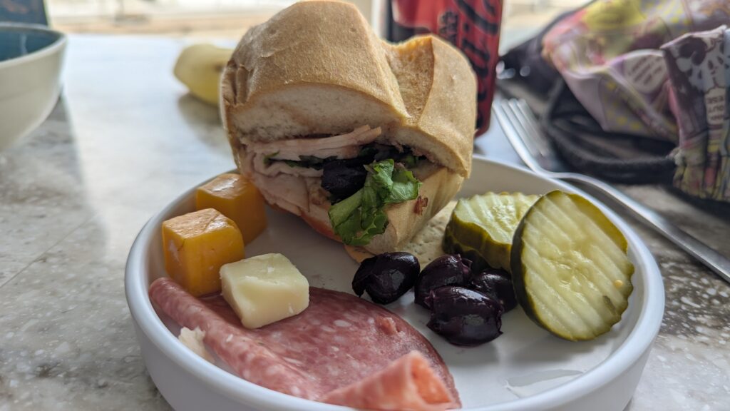 I had such a a good meal, I had it twice. Little tasties were so good – perfect pickles, olives, cheese, and sausage – but the stand-out was the turkey, brie, and caramelized onion sammich. Wow. Just perfect. I ended up picking up a third one (they were only an inch wide) as we walked out. One should always notice when they are living their best life, and I did.