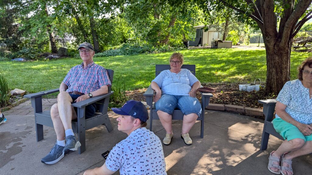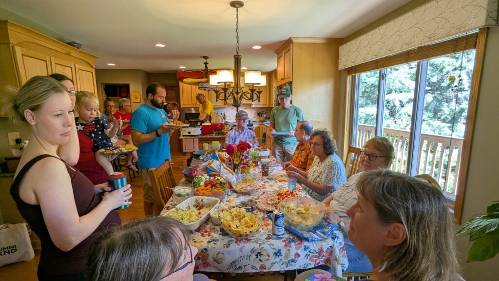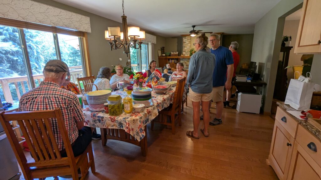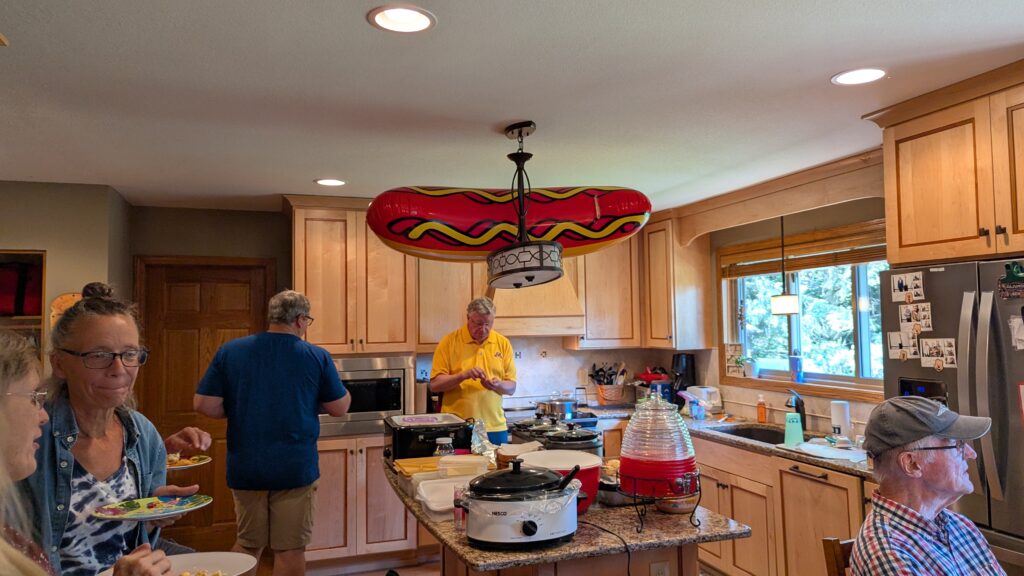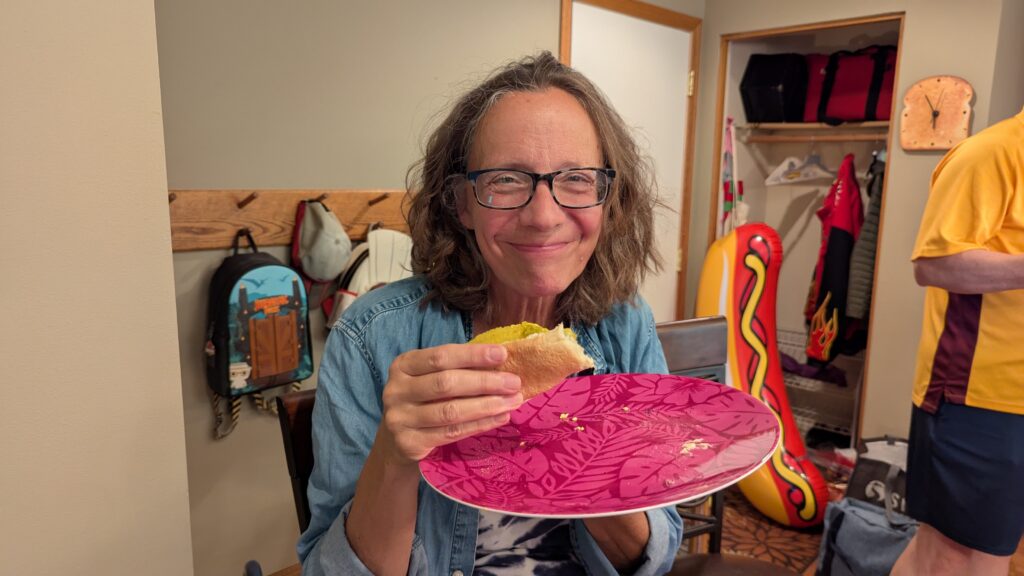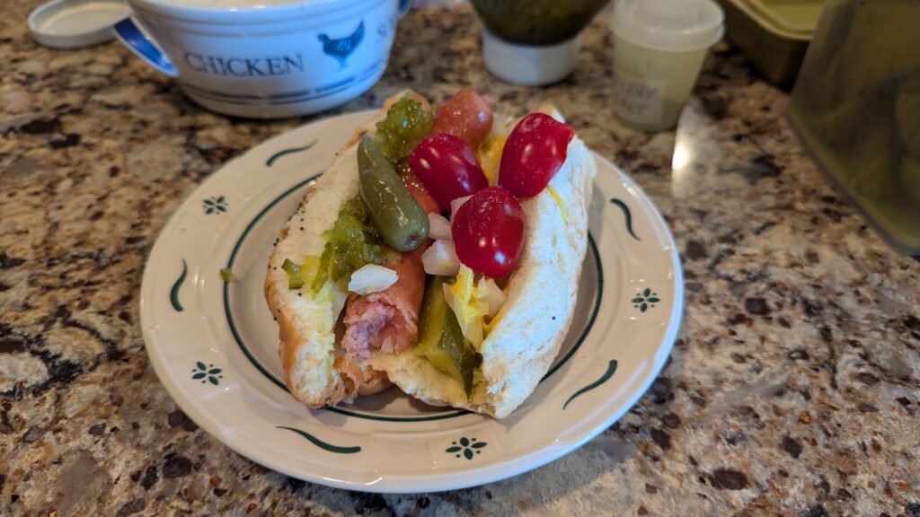 My sister, Donna, and Michael came to the party. We got hamburger and round buns so she could have a burger, because she does not like hot dogs. She said no no no, no extra work for me – there is enough to eat without a hamburger (there was). Then I turn around and she is dressing a Chicago hot dog. Mmm? Then she sat down and ate it. All of it. She thought it was pretty good. She thought maybe she had never had a hot dog. She really, really hates the smell of cooking a hot dog in water – dog water is the worst smell ever – so perhaps she just extrapolated her hate of hot dogs. I thought it was mind boggling.