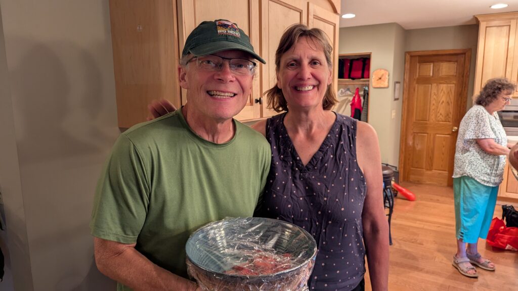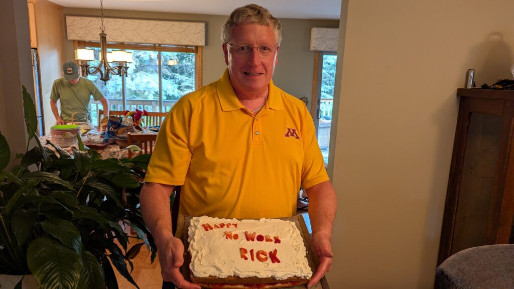 We had a cake for Rick, who is retiring at the end of August. We wrote on it with cut up strawberries, because the topping was whipped cream instead of frosting. “No Work” is shorter than “Retirement” and that matters when you are cutting out letters.