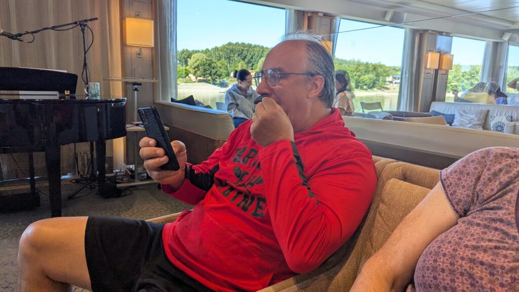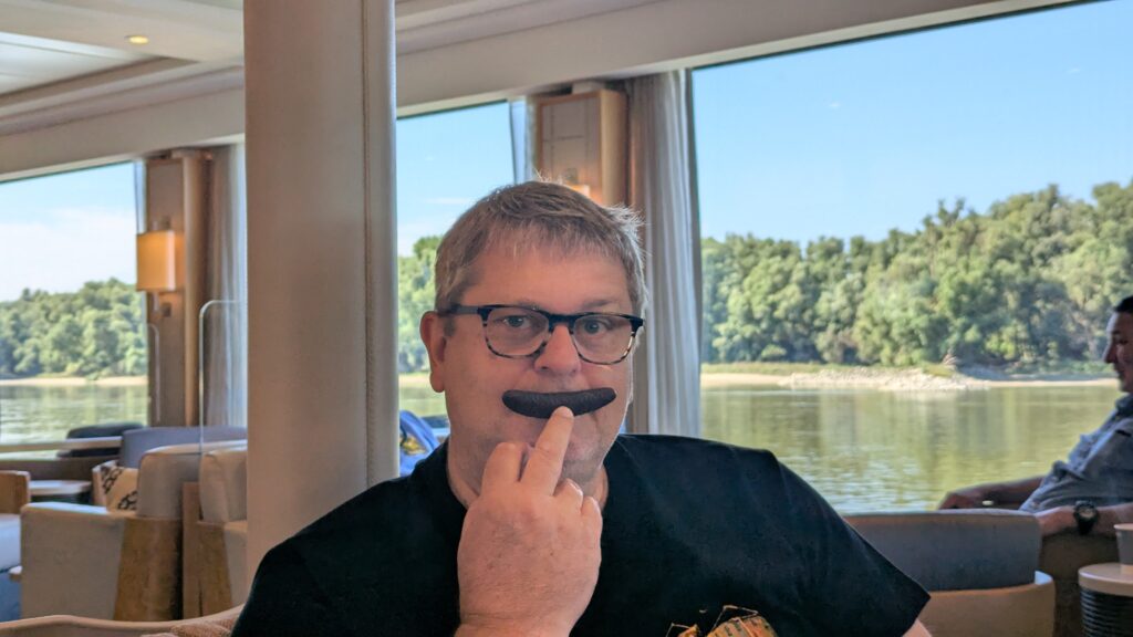 We arrived in our final country this morning, Hungary. We played the second game of the trip – a movie/music quiz. The first 10 questions featured a movie poster with the title removed at the same time as a tune from a different movie played. I don’t know if it was supposed to distract us or what, but they were very simple. The second they played a short clip and cut it off when there was a famous quote coming next. We missed the Godfather (2) quote keep your friends close, but your enemies closer. The last section had us watch the Singin’ in the Rain scene of SitR, then asked us questions about the background etc. We won and it was fun. Our prize was a “Yugoslavian” box of chocolate covered “bananas”. They were very sweet, but tasty. There were a gazillion in the box and we shared all around. Keith made a smile, or a mustache, and another member of our team (name? no idea) was looking at himself in the phone and just cackling with laughter. It was joyful! I loved it.