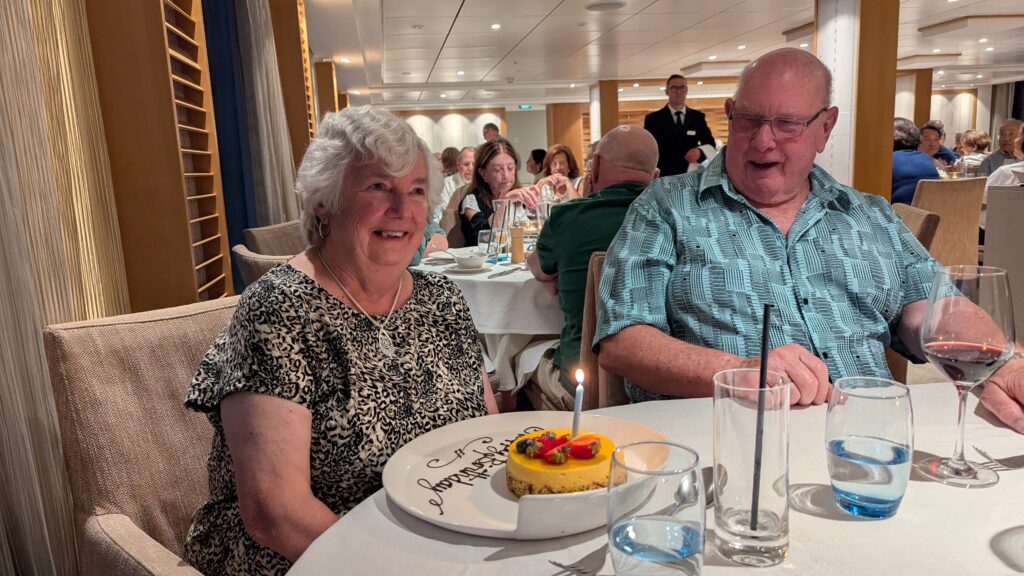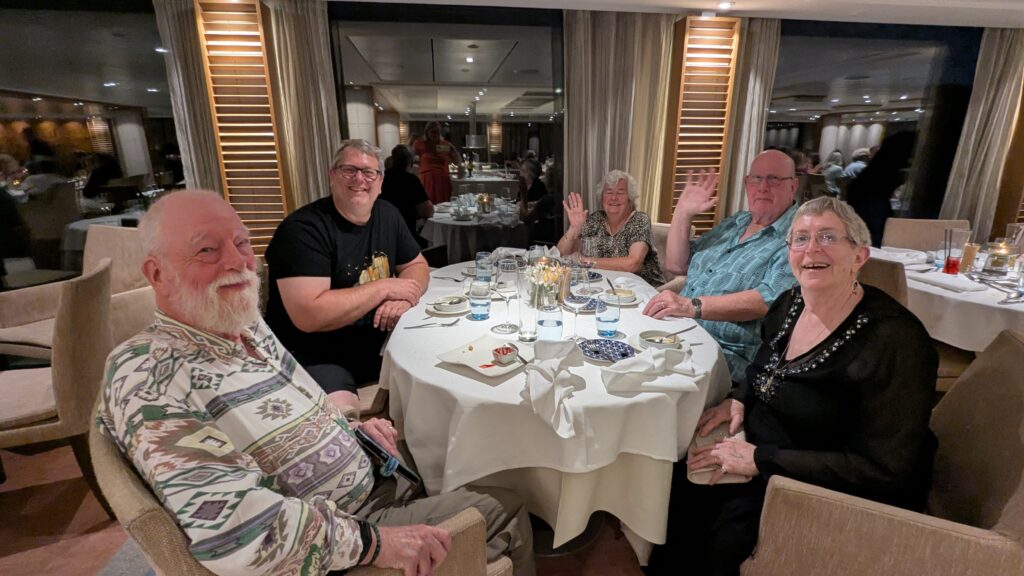 We had dinner with four of our people – Toni, Eric, Alex, and Joe. It’s Toni’s 80th birthday tomorrow, so we had a surprise cake delivered.