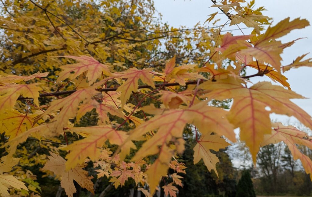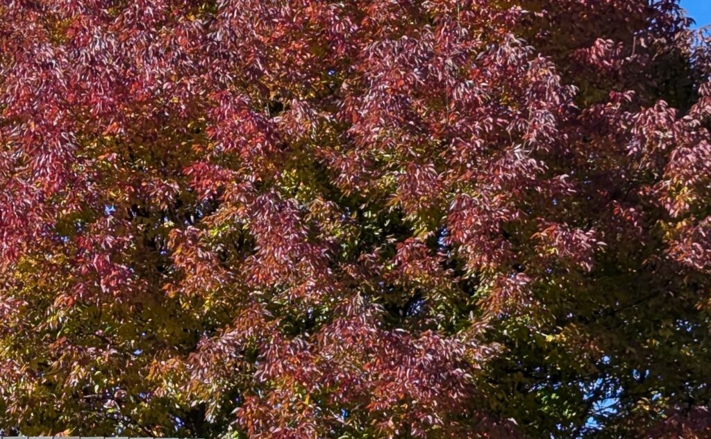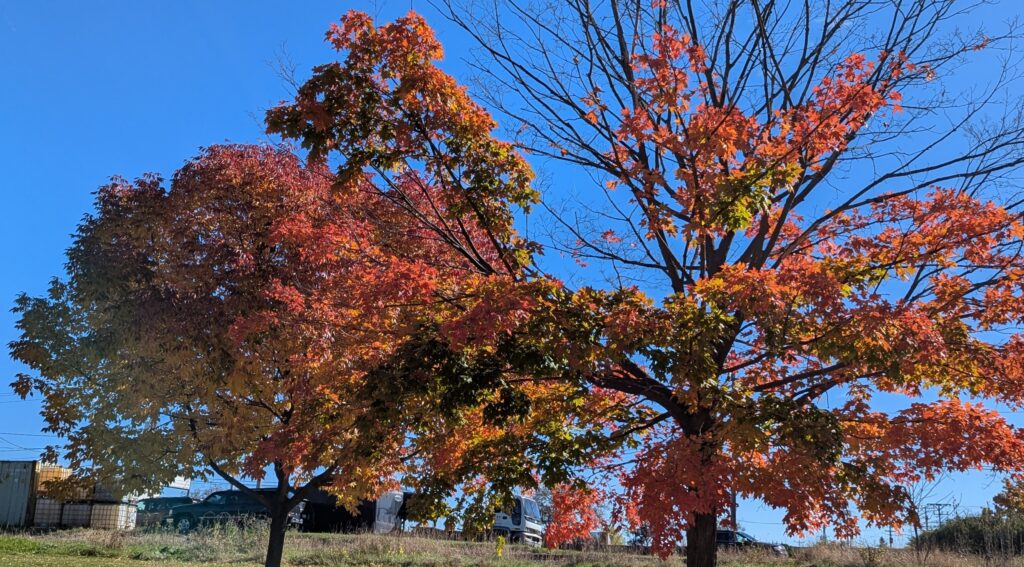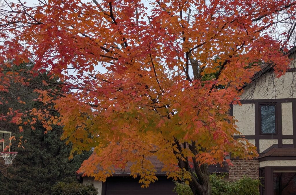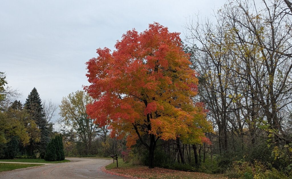 I have been saying all month – I love what they’re doing with trees these days. Fall trees are better than they used to be. There are more colors on each tree at a time. You see combinations of green and yellow and orange on one tree! It is spectacular. We saw some yesterday (was that just yesterday?) that were dark burgundy with bright green showing through. Amazing. They did not do fall trees like that years ago. The trees were yellow or red or orange. No mixing. There are still old-fashioned trees out there too, giving support to the multi-colored trees. It wasn’t sunny today, so my pictures are meh. Some of the trees have leaves of different colors going on at the same time, but a lot of the trees are having leaves of multiple colors. Good job with the trees, whoever is in charge of trees!