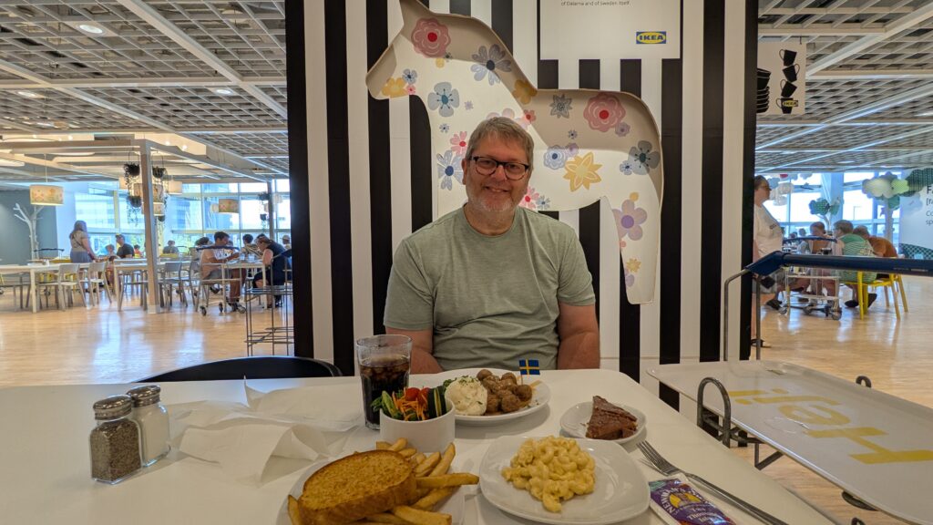 We were there for three and a half hours. Of course, that included Swedish meatballs for lunch. We discovered they have excellent diet cola (that is what it is labeled on the dispenser). I had the great idea of getting something to eat when I saw a piece of 5-layer cake, each layer a different color. Notice we didn’t actually get colorful cake. We got “almondy cake with chocolate crunch”. The chocolate tasted like Europe and it was wonderful.