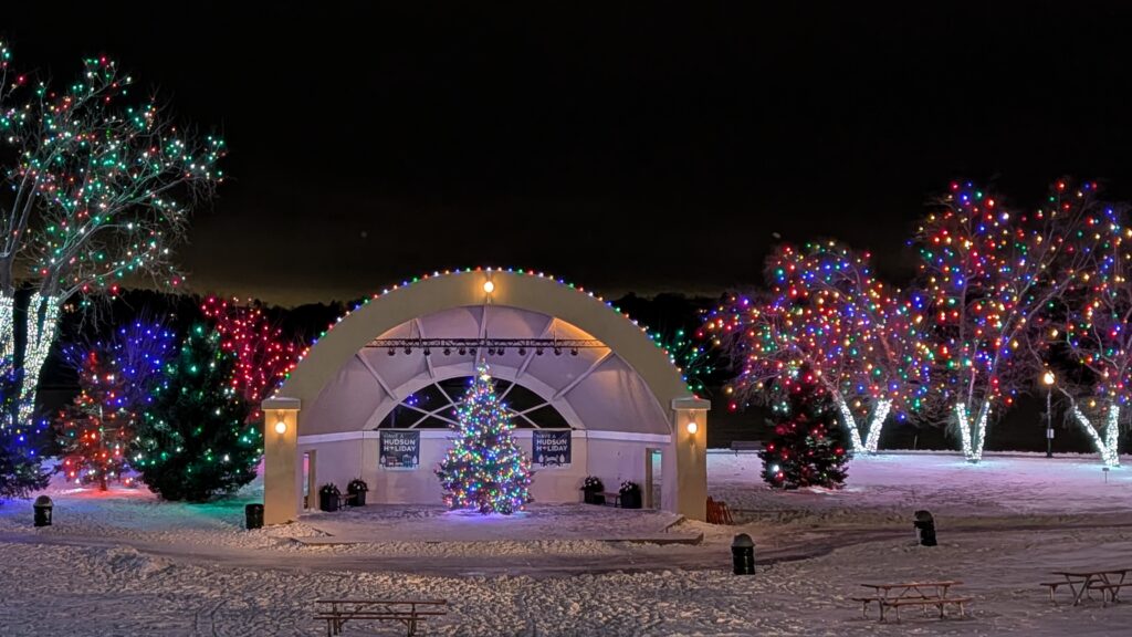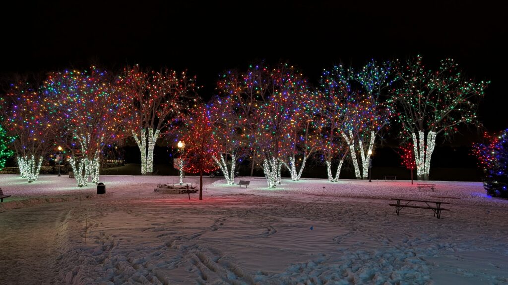 Nap after school – famous bowl for dinner (it was already a complete loss as to anything healthy about today) – rice Krispie treat at a bake sale at the theater – walking in the snow under BEAUTIFUL lights with Keith. What a wonderful life!!