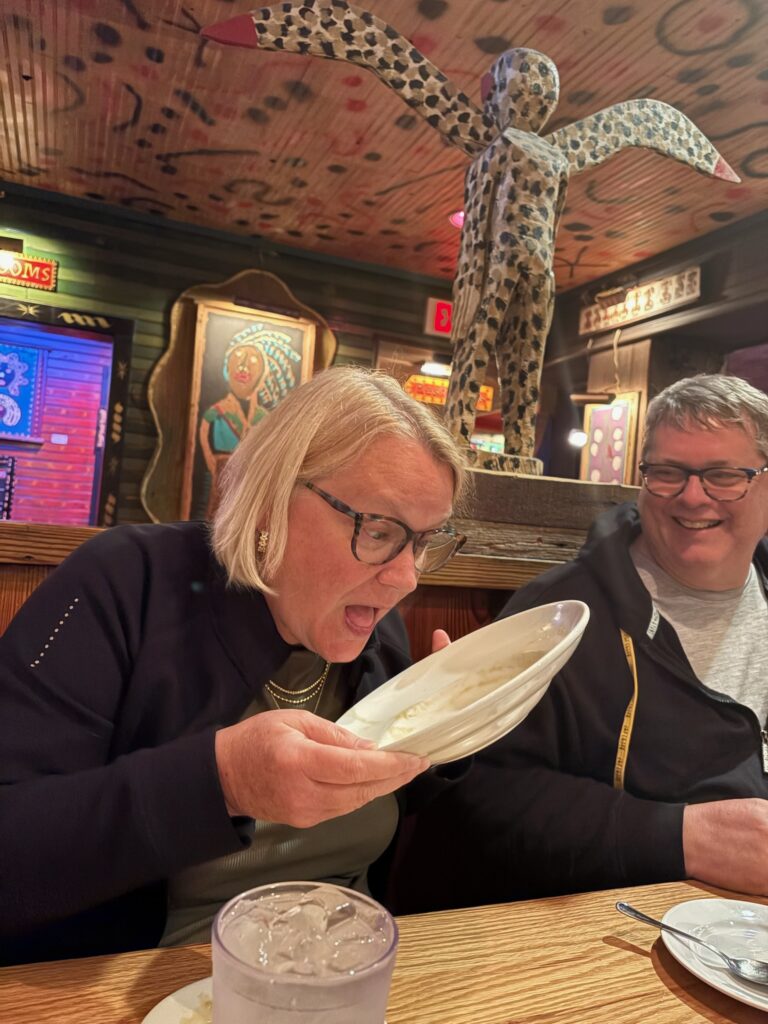 We went to hear live music (with instruments actually played by the people) at House of Blues. The stand-out part of the meal was the bread pudding with toffee sauce. The sauce was so good that when everyone else went to use the restrooms, I utilized my finger to scrape every bit of it out of the bowl. My finger!