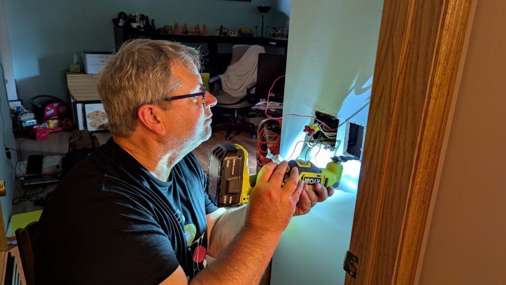 Of course there is no such thing as just doing the project you started off to do. There always has to be something else that you don’t know about, right? He started with having to move a light switch around the corner. It was in a very odd place, and I pointed out that he could just cut holes in the wall wherever he needed to expedite the process. Then, of course, it wasn’t that easy, but he got it done. It took all day and it is not quite done (a little alignment yet to do), but it looks great so far.