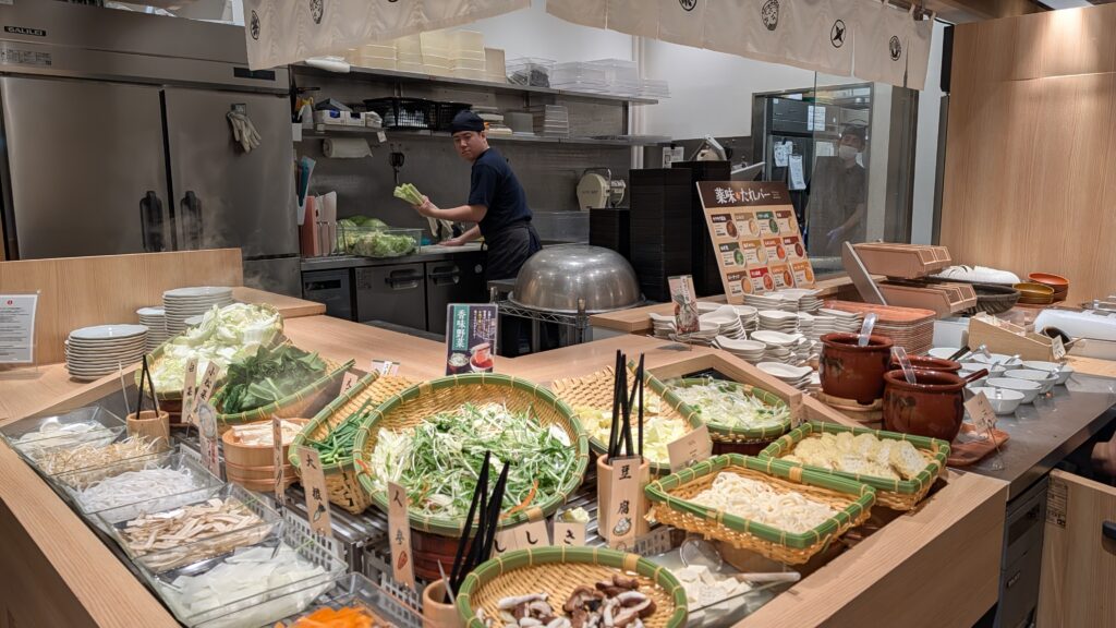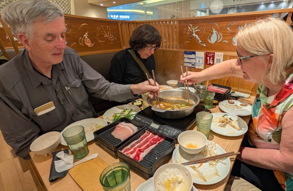 The very first restaurant we saw at the top of the escalator turned out to be the answer to everyone’s desires. It is a type of dining called shabu-shabu. It is cooking at your table in liquid (not oil). Mike had heard of it but had never done it. You could order pork and or beef, then have as many vegetables of your choosing. We got to choose two different soups to cook in. We chose a chicken stock and a spicy something. I never got around to trying the chicken stock because the spicy something was wonderful. This is everything I wanted Japanese food to be. We dipped our vegetables and meats into the boiling water and cooked our lunch. Everything was delicious. Kristine was really jamming on the peanut sauce until I introduced her to crunchy soy sauce. It was lots of sesame seeds (I think) in soy sauce. It was absolutely delicious. There’s a 90-minute time limit for you to eat. They will refill your soup as much as you want. We ordered the standard meals, each getting 6 slices each of beef and pork. We could have ordered all we could eat, but we figured what we saw on the picture was really all we could eat. We were right.