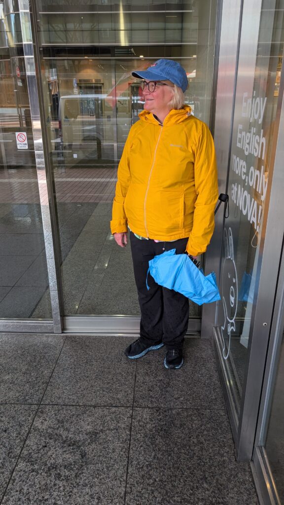 We sat on the benches for a while and chatted, listened to a little music, and enjoyed the quiet surroundings of the park. We moved on, got a block away and the skies opened up. We jumped on a bus and came back to the hotel. Mike knew how to use our IC cards to pay for the bus and which bus we should take. He is wonderful.