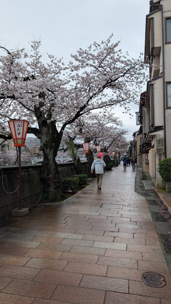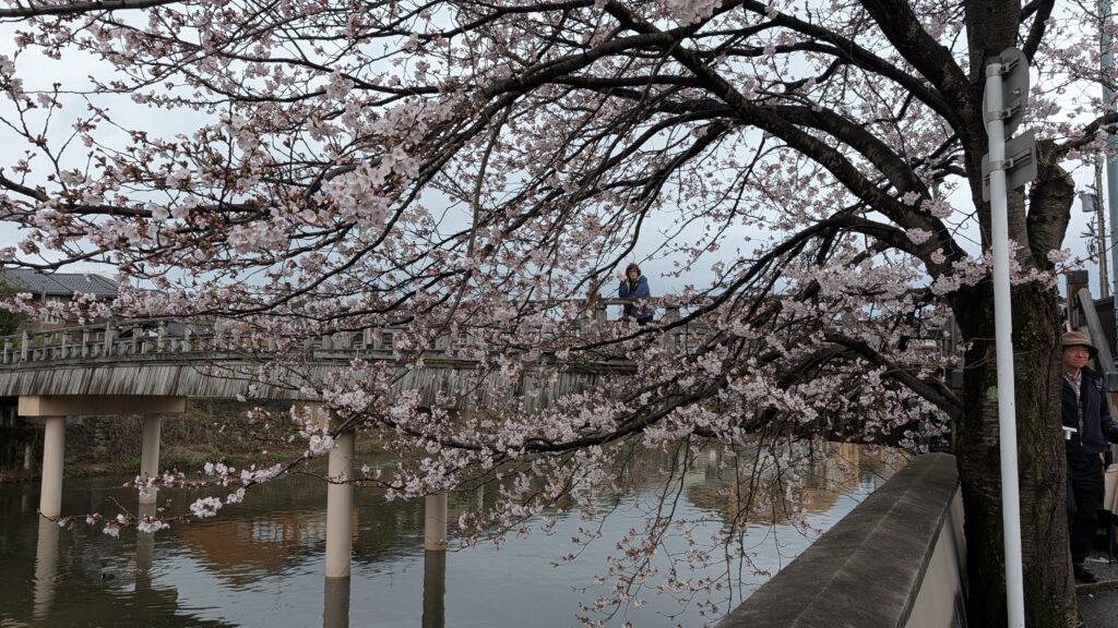 We mosied here and there and saw lots of cherry blossoms. We stopped in a little park that had a view of some of the original double walls that had once surrounded the town. There were benches under cover at a bathroom. Japan is winning bathrooms. Everywhere we’ve been there are ample, clean bathrooms for free. Europe could take a lesson from Japan. The United States could take a lesson from Japan.
