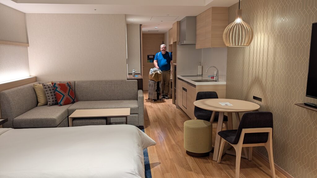 We checked into our hotel which is barely outside the train station. The room is enormous, especially by Japanese standards. We have space to put the suitcase that isn’t right on the bed. None of our other hotel rooms have had that much space. We have a little kitchen-ish area that we will not be using but it makes it feel very luxurious.