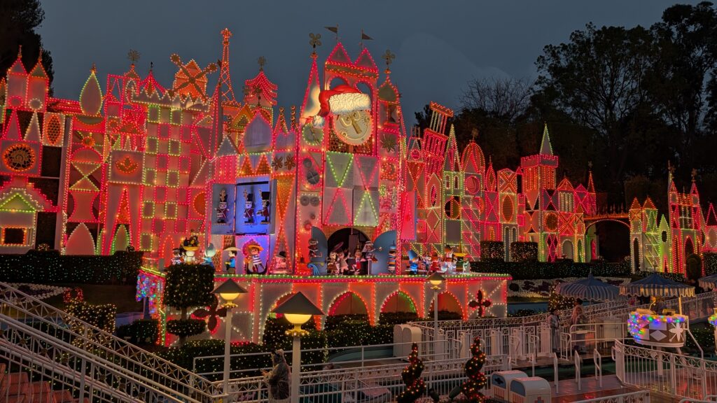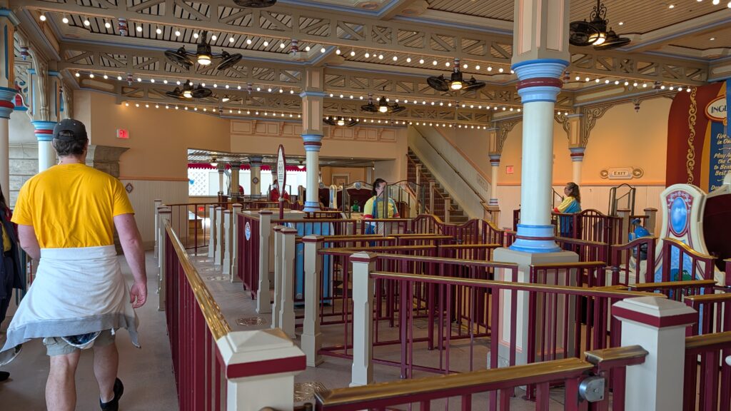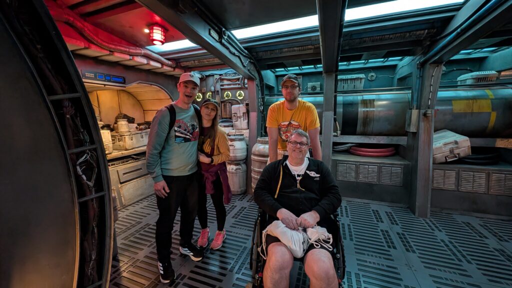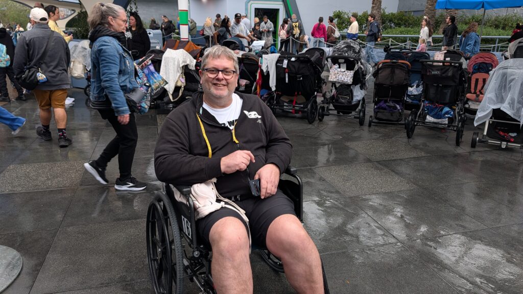 On Small World, they let us drive the wheelchair right up to the boat and park the chair right there. Unfortunately, we got off the boat on the other side. Every boat loads on one side and unloads on the opposite side. Huh. We had to ask the lady running the boats what to do. She called over some other cast members and they all said, “Oh. Just walk across the seat of this boat to the other side.” The wet seat on the wobbly boat. That seemed like a disaster waiting to happen. Benjamin guided him across the slippery surface, then pushed him up the entrance line (against all the people coming in) to get out of the ride. Again, possible, but not easy.