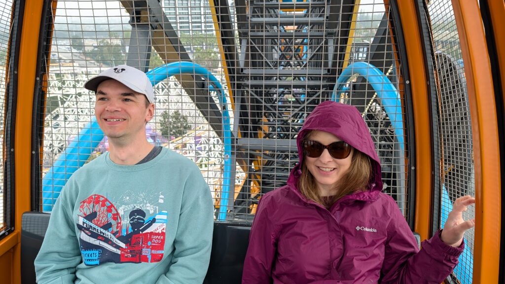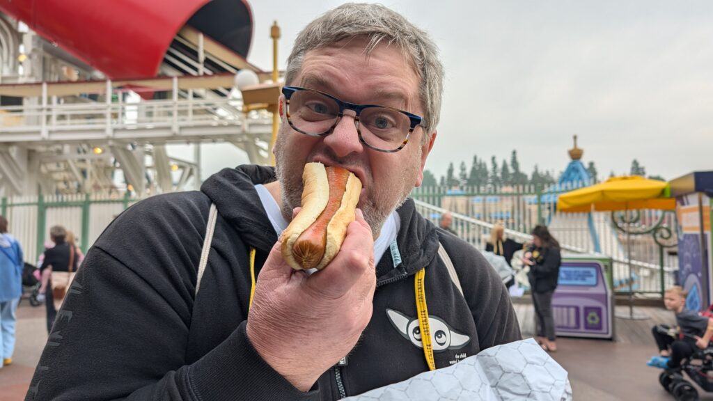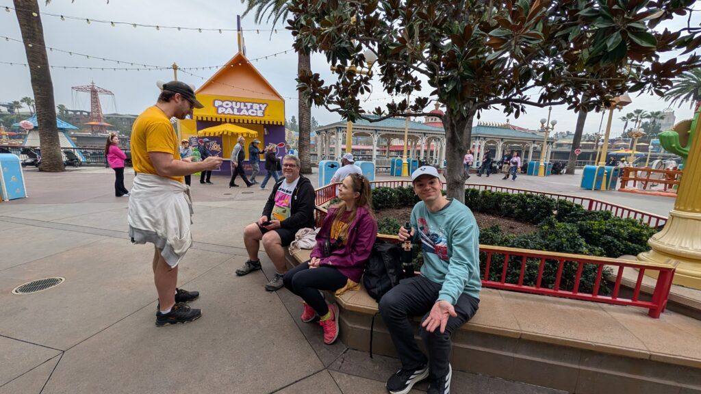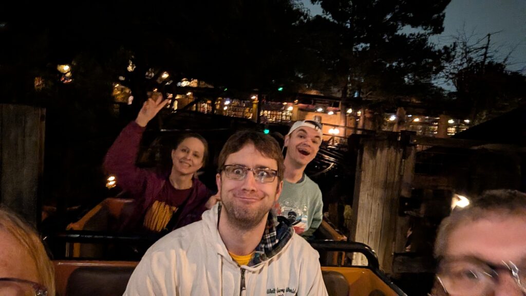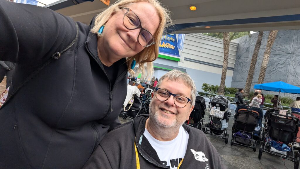 No sense in burying the lede – Keith fell down. He read us the weather before we left this morning. 17% chance of drizzle at noon. What they meant was the rain would start about 10am and last until 6pm. It would sometimes be drizzly, but mostly be rainy. Benjamin spent several minutes yesterday talking about how weird California is – everything is outside. The line queues are outside, parts or all of rides are outside. In Florida, they know it is going to rain every day and be HOT every day, so most stuff is inside. I sang the “it never rains in California” song for him. Apparently both the song and I lie.