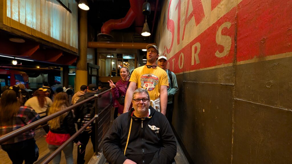 On Indiana Jones we were all sure Keith would have to walk a lot because there are stairs and we were certain there was no elevator. We were wrong. It was right there. You go up, walk about 10 feet, then take another elevator down.