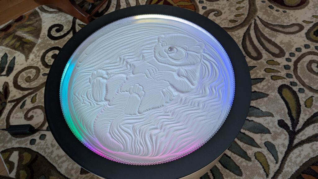 Surprise, Keith! Happy two birthdays, a father’s day, and two Christmases! He set it up very quickly and it made us a picture of an otter (Keith’s choice). It took about 2.5 hours to level the sand and make the picture. It is really relaxing to just watch it – but also fun to go and come back to a bunch being done. It came with a little bag of powdery sand. It did NOT look like enough to cover the area. I was sure we would need to order more. Wrong. It actually seemed like too much once it was in the table. Weird.