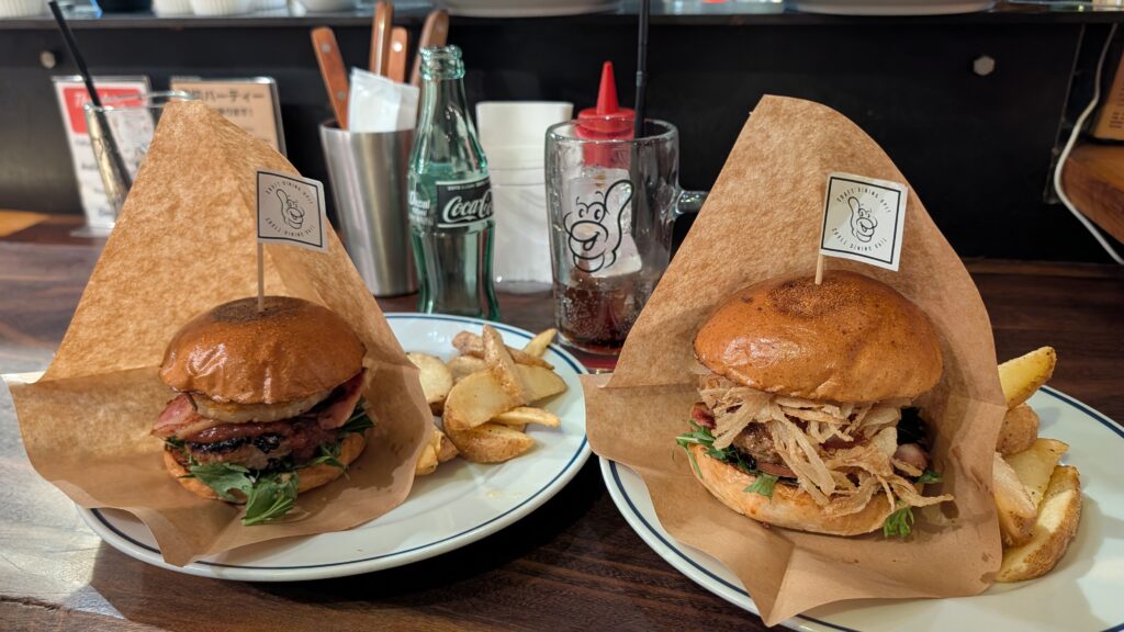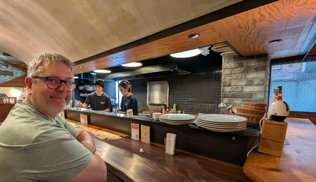 We trained away to a neighborhood known for people wearing traditional clothes. Kristine found a gluten free ramen shop, and we found a burger place next door. We were going to ramen, but the burger smells lured us in. Lucky us, because our meals were terrific!! Mike’s ramen came with raw beef slices on the edges of the bowl (curious), and the ramen lady came and used a torch to cook them at the table. Not gonna lie, that would have been cool. But still, Upit burger for the win.