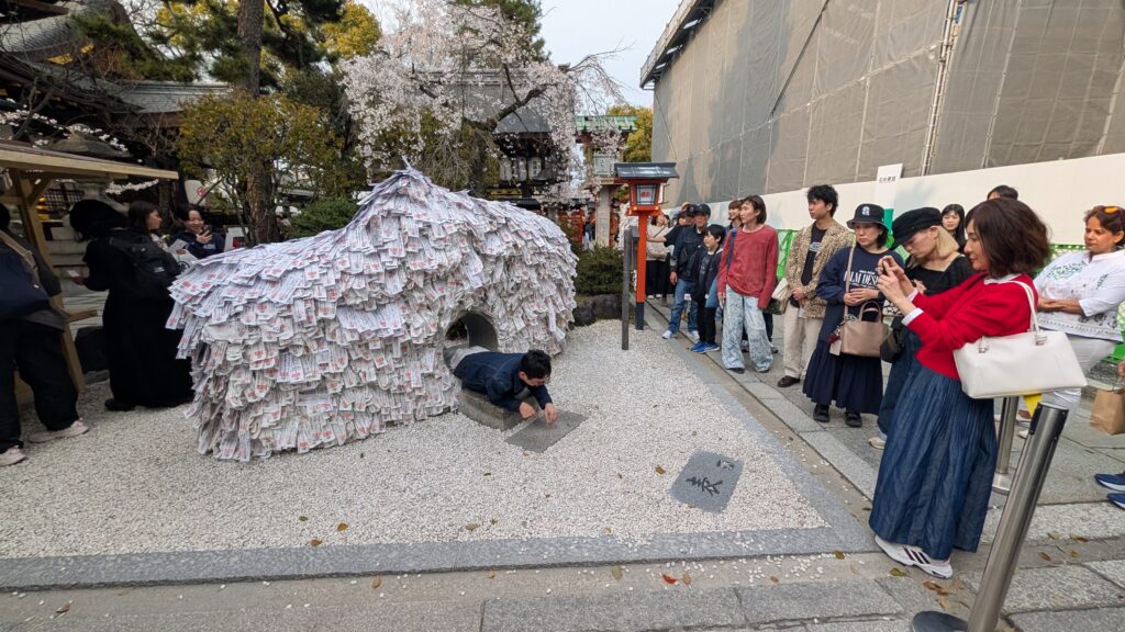 At a shrine, people were putting prayers on papers – then if you could fit through the hole in the bottom it would increase your chances of your prayers coming true.