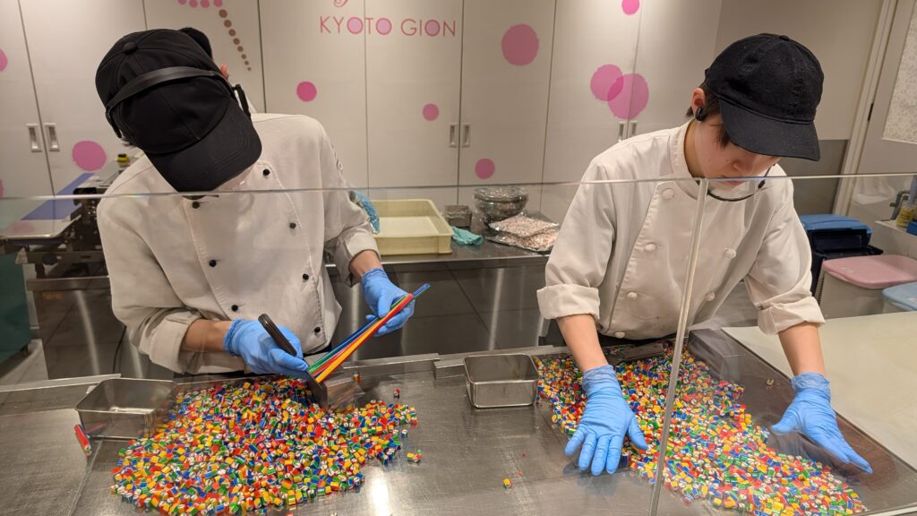 As we were walking to the train, I heard a distinctive click click click coming from inside a store. I had watched a video about making candy before we left and I just KNEW that was what was happening inside the Candy Show store. I was right. They were on the last step – snapping tiny pieces of candy off the long sticks that had been rolled out. There were so many choices, by the time I came out, the ice cream brigade had scored their latest treats. My candy was better.