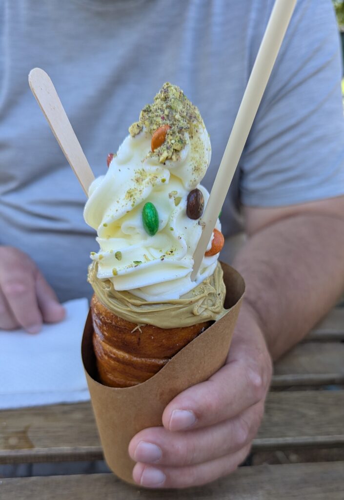 We finally had a chimney cake. They have been everywhere, but we have not been hungry. They wrap dough around a cylinder on a stake and then they roll over a coal fire. They cover them in sugar or other flavors and you pull and unravel it. We ordered a small one with ice cream and pistachio cream. A tasty funtivity for sure.
