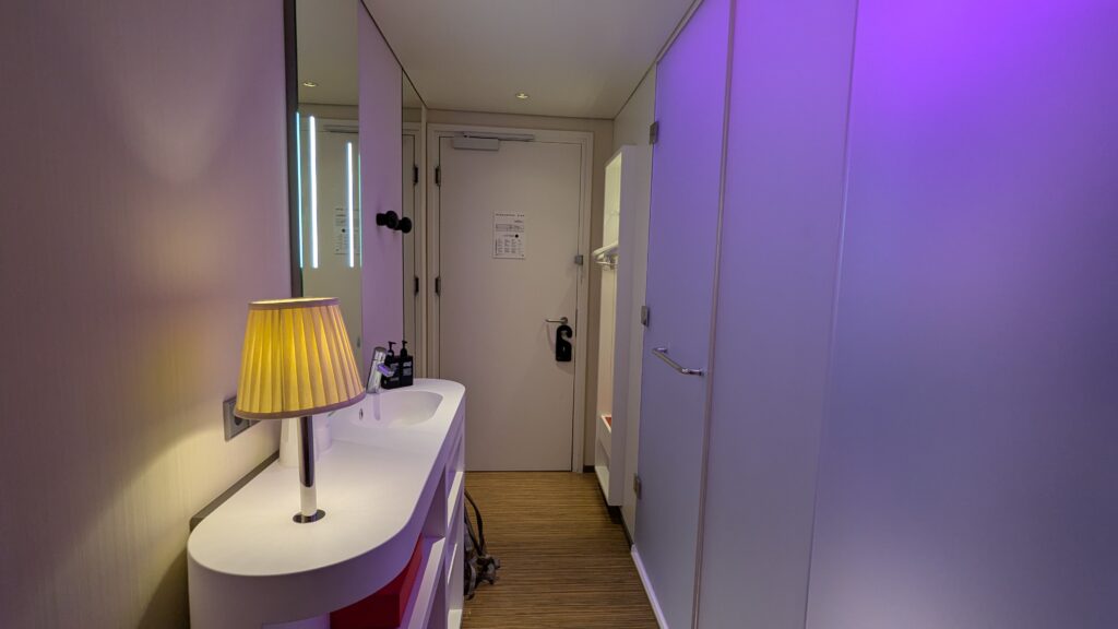 Our hotel room for tonight is at CitizenM by the airport. Last time we were here, our room was quite different – with the shower and toilet in room behind screens. Now we have a separate room for them ( with glowing purple walls). Our next flight is in 11 hours – which seems pretty perfect.
