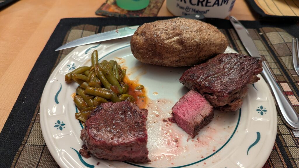 I got the best food that has ever been cooked at our house. It was truly amazing. We got a new pan in the mail last week. Keith had said that a fancy pan was going to come free with our new stove that we got some time since we moved. Then he said it wasn’t coming. Then it came. It is remote control or something. It talks to the stove. But now the company is going out of business, so you can’t use something and isn’t it sad for people that bought the cookbook and the pan? That is what I got from listening (or not listening) to him talk about the pan. Anyway, the pan perfectly cooked the steak. He tried out airfrying the baked potatoes and they were great. He got a recipe for bbq green beans and they were terrific too. Three amazing things, all at once, in our house. Unbelievable.
