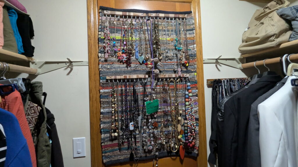Every once in a while, we remember we are supposed to look inside the boxes all over the house instead of just ignoring them. I did a few today and Keith tackled the necklace dilemma. I had a great spot in my old closet that I hung little hooks for necklaces. We figured the only place here was on the back of the closet door. We had two sinks at the old house, and two awesome leather rugs. We took the extra rug (which I love so much) to use as the backing for the necklaces (so they wouldn’t clank around). Keith worked through the weaving and did a great job. I am so happy to see the jewelry after a couple months. I will wear a whole bunch tomorrow.