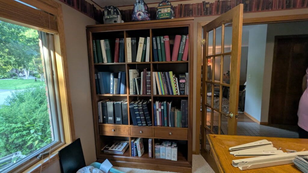 I looked at the pile of scrapbooks in the craftroom-to-be and immediately went to the computer to check Facebook Marketplace for a shelf. I have looked a couple of times and didn’t find anything appropriate. Today I did. I sent a message, guy wrote back, Keith texted Tom-with-truck, Tom said I’ll take a shower and come over, and off they went to Coon Rapids.
