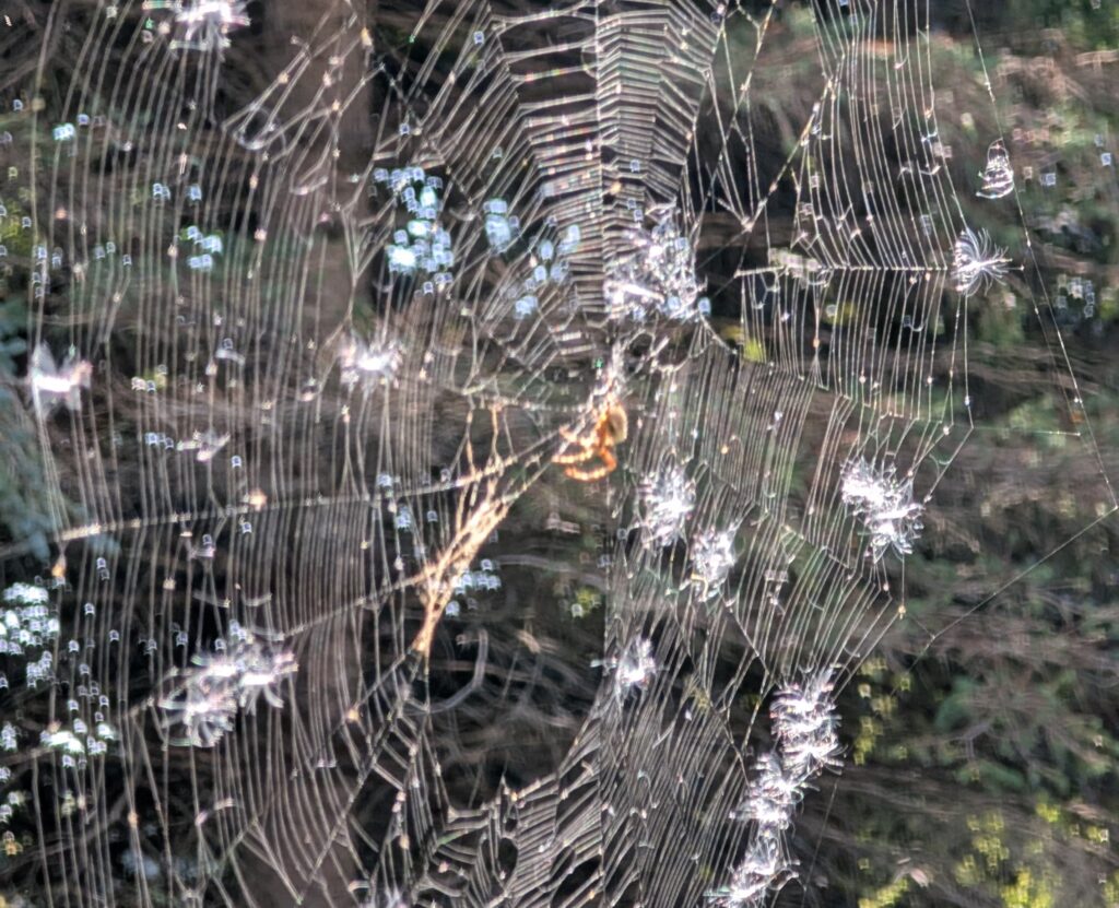 This spider was in our backyard. He was very large. I was not a big fan. He had a pretty web, though. Now he is gone. I hope he is not in my house, because then I would have to move.