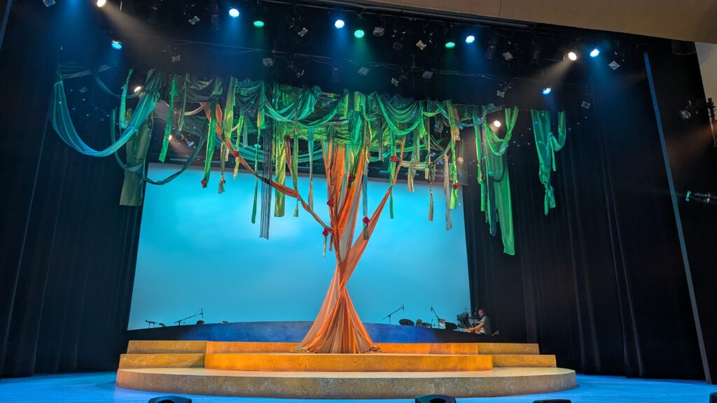 We went to a beautiful show tonight at Artistry – Once on this Island. Gorgeous dancing and wonderful singing. And at the end, there was a tree (see potd). EB and Kathy came for dinner beforehand, Keith got lost twice on the way home, and the evening was stellar!