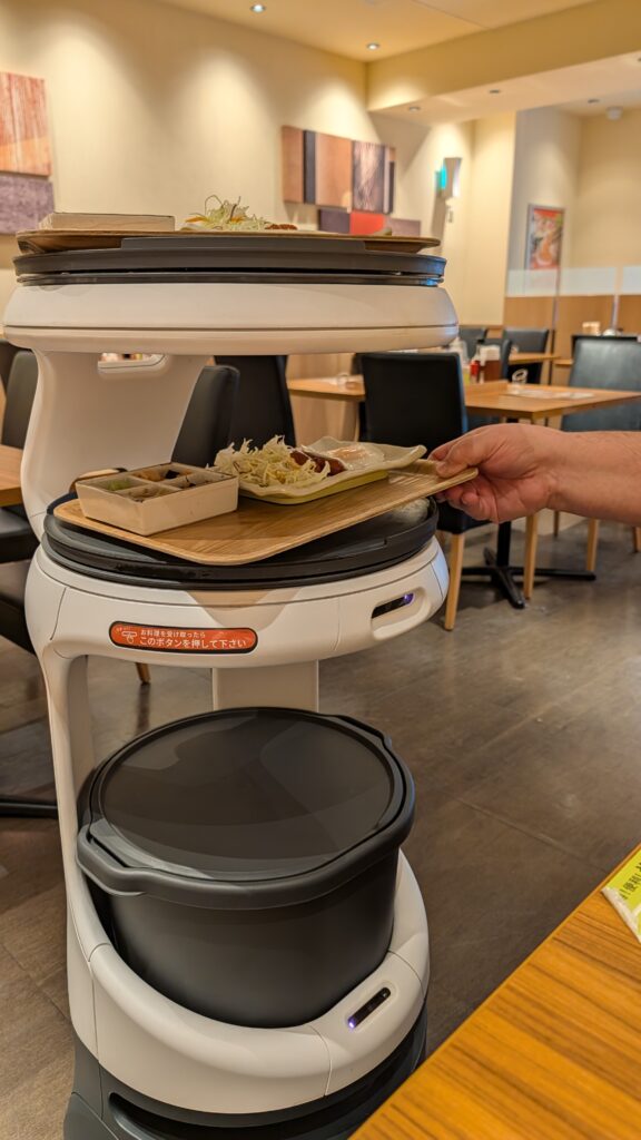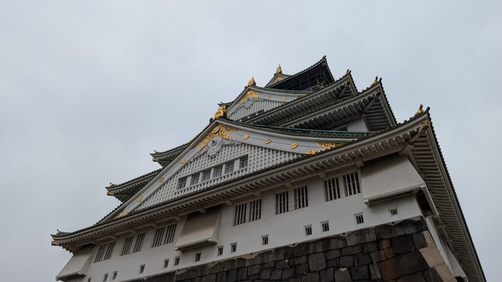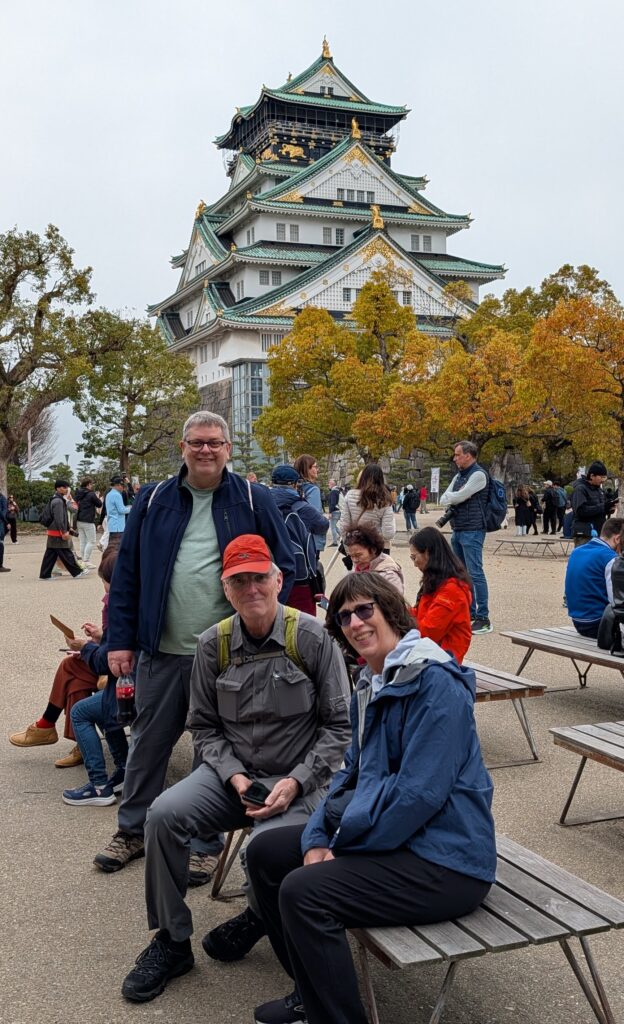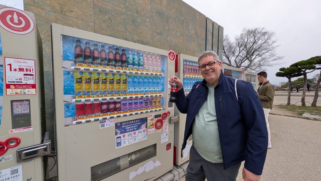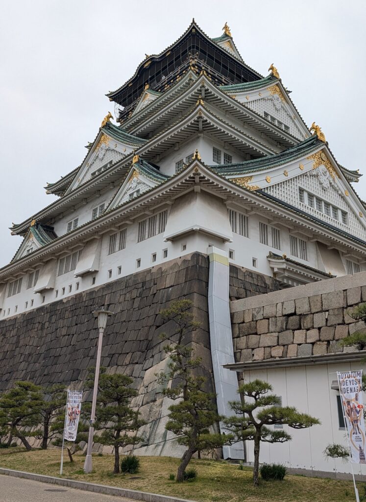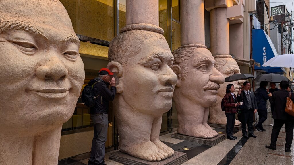 Breakfast at our hotel restaurant was served via a robotBreakfast was pretty odd. One undercooked egg, two small sausages, dry shredded cabbage, and some little bits of unrecognizable food items. Neither is us thought much of it.Osaka CastleThe castle walls were clearly built before the invention of the levelOr before any means of measuring stones to make sure they’re the same size and shapeLooking out at the city from the top of the castleThe five-storied pagoda at the Shitennō‑ji Buddhist temple, which was rebuilt eight timesMust be on their way to take wedding or engagement pictures at Shitennō‑jiThe Shitennō‑ji Temple is a large complexThe turtle pond at Shitennō‑jiOne of the Shitennō‑ji gates, this one with what looked like two genies, a red one and blue oneI can only guess what’s happening here… maybe what happens when you try to take a picture down the well at Shitennō‑ji, but have the camera set for a selfie Our maybe trying to take a picture of the ceiling of the wellThe entrance to a cemeteryThese cemetary statues were dressed upThe best thing at the cemetery Every now and then you come across beautiful plum treesOr cherry treesThis department store has a large ride in frontGiant Pokemon cards on the side of a buildingThese vending machines are everywhere along the streetsTakoyaki is deep fried octopus, as clearly explained by this signTsūtenkaku (“Tower teaching heaven”)I don’t know what Mike is whispering to this guyMany different flavors of kitkat barsTrying to figure out trains
