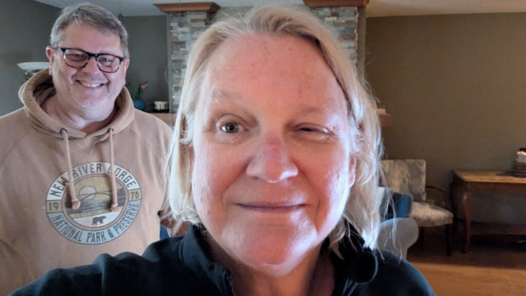 I had to keep facedown for the remaining hours until I reached 24 hours after surgery. It was fine. I talked on the phone for most of that time. My vision is just light and dark and movement if it is close. They want me to use my eyes together — open open or closed closed. I have mostly been closed because my left lid is swollen and doesn’t want to open much and when it is open sight is just a mess. I have to wear a patch at night so I don’t scratch, but they also said I could patch if I just want it to be closed. I am patched tonight, and we are going to try to watch TV. I can’t really get my glasses on with the patch, so I don’t know how it is going to work. I have to be upright or on my left side, so I can recline. Maybe I will stay awake for the movie.