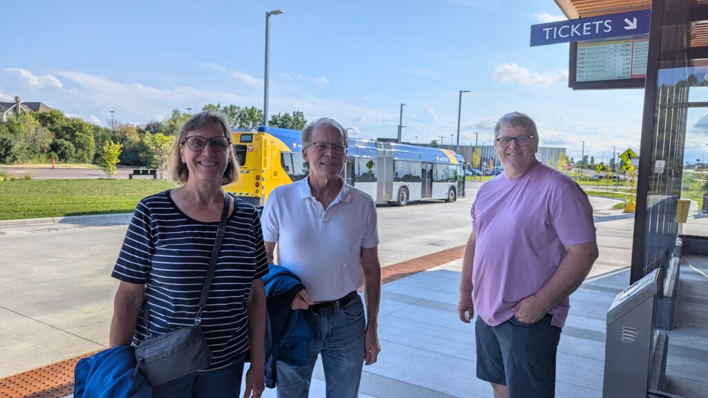 They built a bridge over I-94 and a dedicated lane for a bus line to go to St. Paul. It took years and presumably lots of money. It opened in June. I know some friends who have ridden it downtown to the Capitol to protests, but other than that, I know nothing. Sue and Peter planned an outing for us (anniversary outing!) to take the Gold Line downtown and have dinner at 1881, the restaurant in Union Depot.