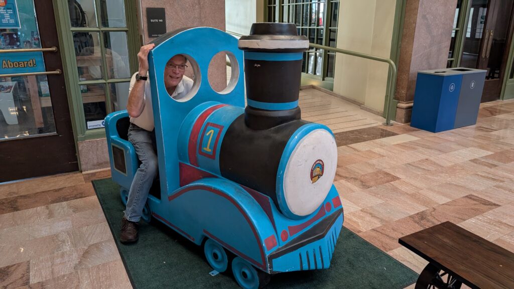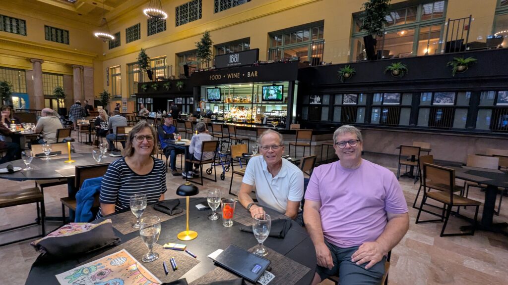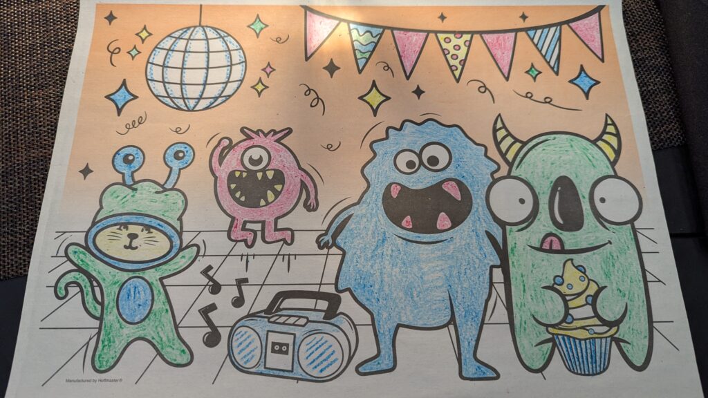 Dinner was delicious in the lovely train station. The hostess asked if we needed any crayons when we checked in and Peter got some for me. I enjoyed coloring while we were chatting. Four crayons really makes you wonder what color to make everything.