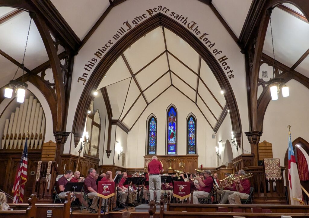 Today, it started raining here about 8am and it rained all day. At some points, it RAINED. We have over 2 inches in the rain gauge Carla found yesterday that I put out front. Red Wing is an hour south of us, but their forecast looked the same as ours. At 12:50, Keith reported no email had been sent yet. I was sure it would be cancelled. We made alternate plans, needing to grocery shop before tomorrow and thinking a $2 movie might be in order. At 1:10 the email came. The show was on! They would play at the Episcopal church right behind the band shell. I was disappointed.