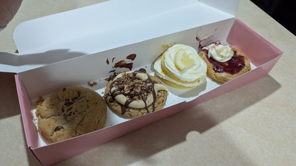 Tom and Louise rode down with us and invited us in for Crumbl cookies afterward. We all tasted all the kinds and it was a sweet end to the day. Speaking of cookies, yesterday’s mystery item is “a vintage Pampered Chef cookie dropper”. Carla made cookies today in order to try it and reported that it was really slick. The tie rack was obvious to those of us over 40.