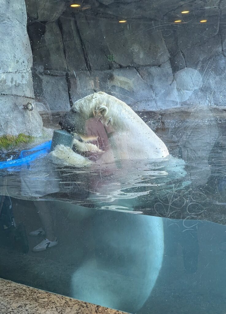 Keith and I enjoyed the polar bear the most. I forgot to ask Kristine and Mike. We enjoyed just how giant he was, and how much fun he was having destroying a plastic kayak. Gorgeous animal.