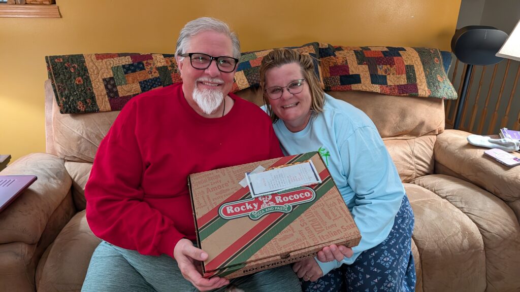 On Monday (first day back after vacation) Julie got laid off. After 18 years of dedicated service, her position was eliminated. Talk about a kick in the head. CRAP! Tonight we put the boys in the backseat, picked up a pizza, and headed out on the half hour drive to Edgerton. We could see Gary and Julie quietly watching TV when we rang the doorbell at ten to 9. They were definitely not expecting a late-night doorbell ring. They were really surprised and happy to have a fun pizza visit. We did good cheering up! Alexander pointed out we are a family of people willing to commit to the bit. Definitely!