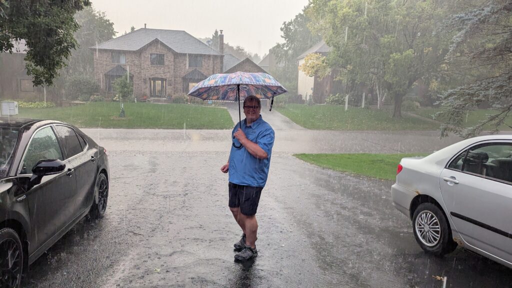 We had tickets for the History Theater tonight, but didn’t think we would get back in time to use them. Friend Carla gave the show a mediocre review after seeing it last night, so the stress was off to hurry to make it, which was great. As it worked out, we were on the road in time to get home to eat a frozen pizza. Just as we were getting ready to walk out the door, it started to rain. Oh, wait. RAIN!!! We lingered because it was too much rain to drive in. We were standing in the garage, watching, when Benjamin pulled in.