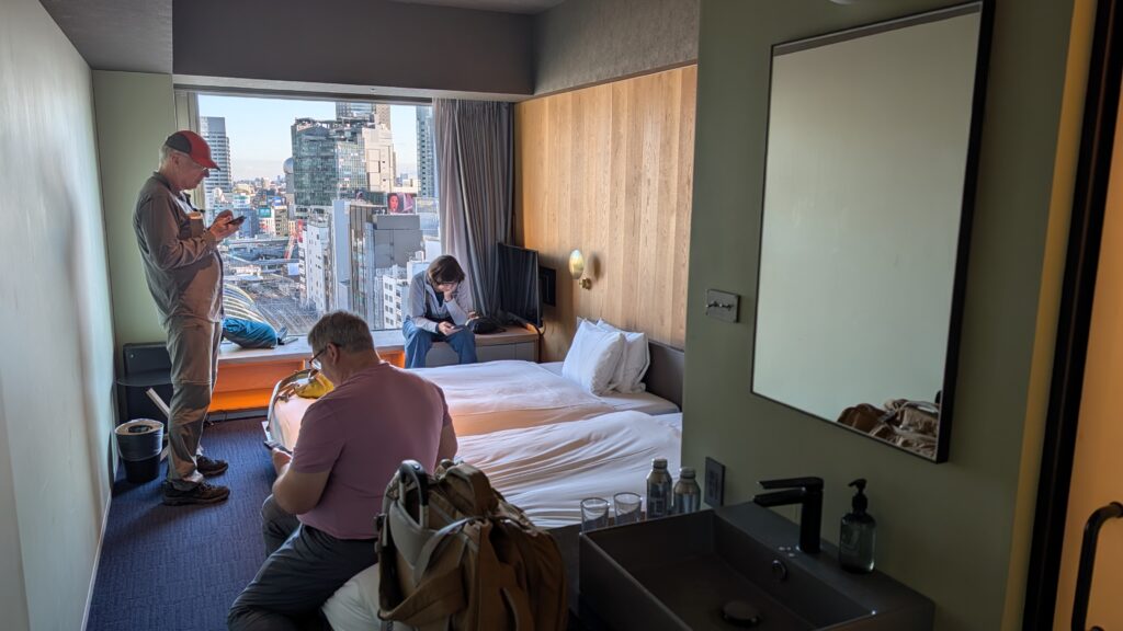 We are in our awesome hotel, on the 15th floor overlooking a park on the roof of a shopping area. Keith is staring out the window trying to figure out which way the ocean is so he knows where to look for Godzilla coming. He is making a plan!