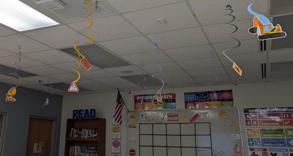 There was a place in the Maplewood Mall called Da Bin (Daa Bin?) It was closed on Wednesday for restocking, then everything was $10 on Thursday with pricing dropping to $1 on Tuesday. On a Tuesday before Christmas, Alexander went and got us each a ridiculous item. I totally surprised him by telling him I knew exactly what to do with my construction themed decorations. The middle school I hang out at the most often is under construction this year, and the theme of the building is Constructing the Future (or something). One of the teachers I sub for as often as I can has quite a few construction decorations in her room. I knew I would be working for her this week, and I would add festiveness to her room.