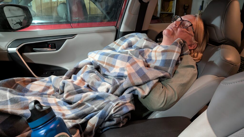 Keith had a rehearsal in Eagan at 5pm today. We had theater tickets and it did not seem possible for him to come home for me between rehearsal and show, so I planned to go along. The thing is, I have been taking TERRIFIC naps this week of working. I do not wake up easily or quickly, so I had a brilliant idea. I came home from school, grabbed the things I would need for the evening, and went to sleep in the car. Keith came out a bit more than an hour later and drove me away. I was awake then, but still cozy and warm in my seat with my blanket. By the time the 30 minute drive was done, I was ready to be awake. It was perfect.