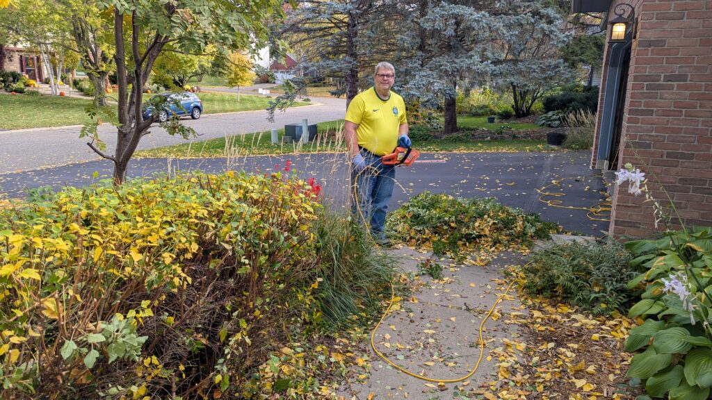 Keith was trimming bushes and mowing up leaves today before it started to rain. I had to wear a sweatshirt outside tonight. Fall is coming!