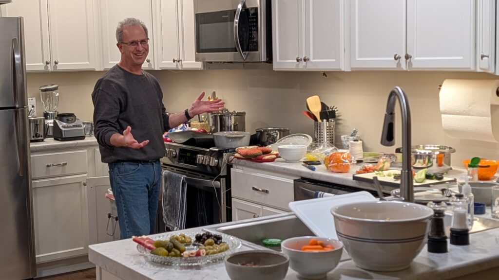 More than a month ago, we scheduled dinner at Bruce’s house. It was a little tricky to find a date, so I did NOT want to cancel. I may feel sick, but I’m not germy. Bruce remodeled his kitchen and we are the first guests to eat there. He pulled out ALL the stops – beautiful appetizers, a fantastic stuffed pork loin, and a delicious creamy dessert.