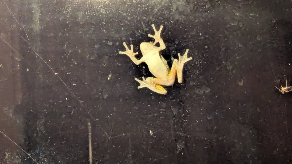 We went to a brass band rehearsal in Red Wing, but didn’t take the convertible. Was it just last week we had to stop for hard rain? It said there was a possibility of rain, so we played it safe. We made it all the way to Prescott before it started to sprinkle. Then it started to RAIN. Then the wind tried to blow us off the road. Literally. Keith was holding on tight and we were getting pushed to the shoulder by the wind. I was only a little afraid. It really seemed like a time when I would be a lot afraid. We got off the highway and took surface roads and it was calmer there. We got home and there was a terrifying frog on the window. I walked in and BAM! Frog.