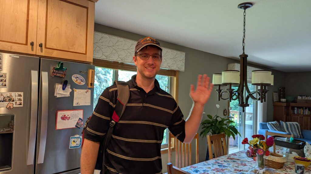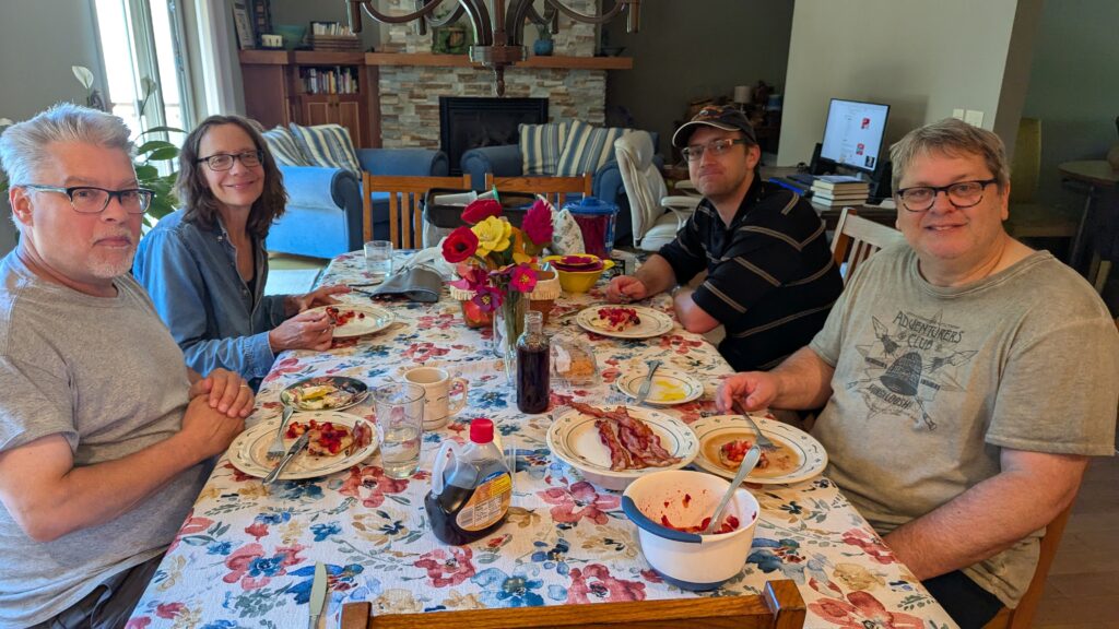 He got home just in time for our home-made Grand Slam breakfast. He did not know what that was, but he enjoyed it.