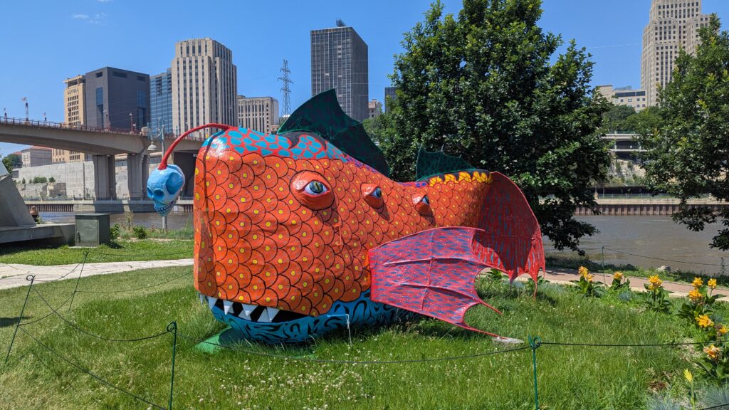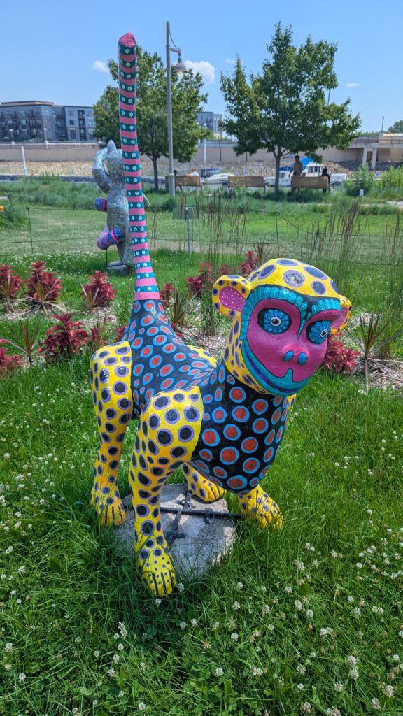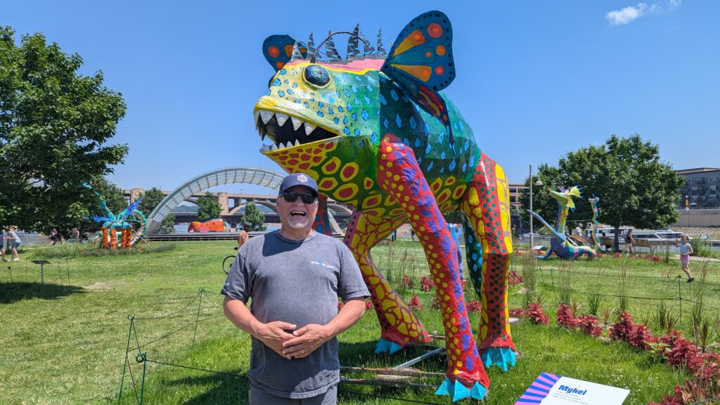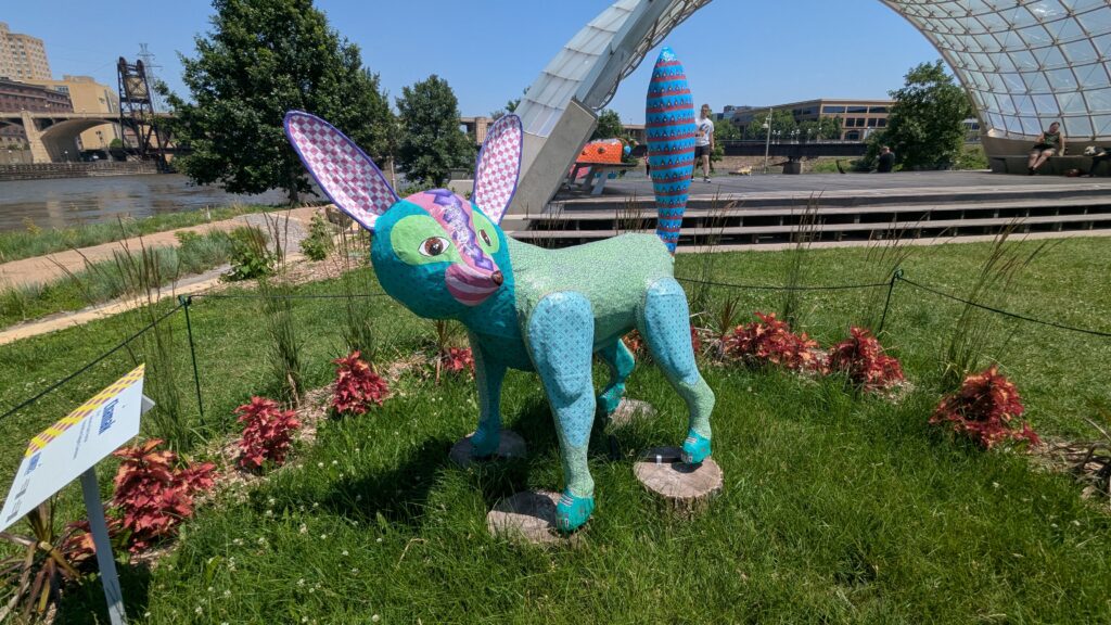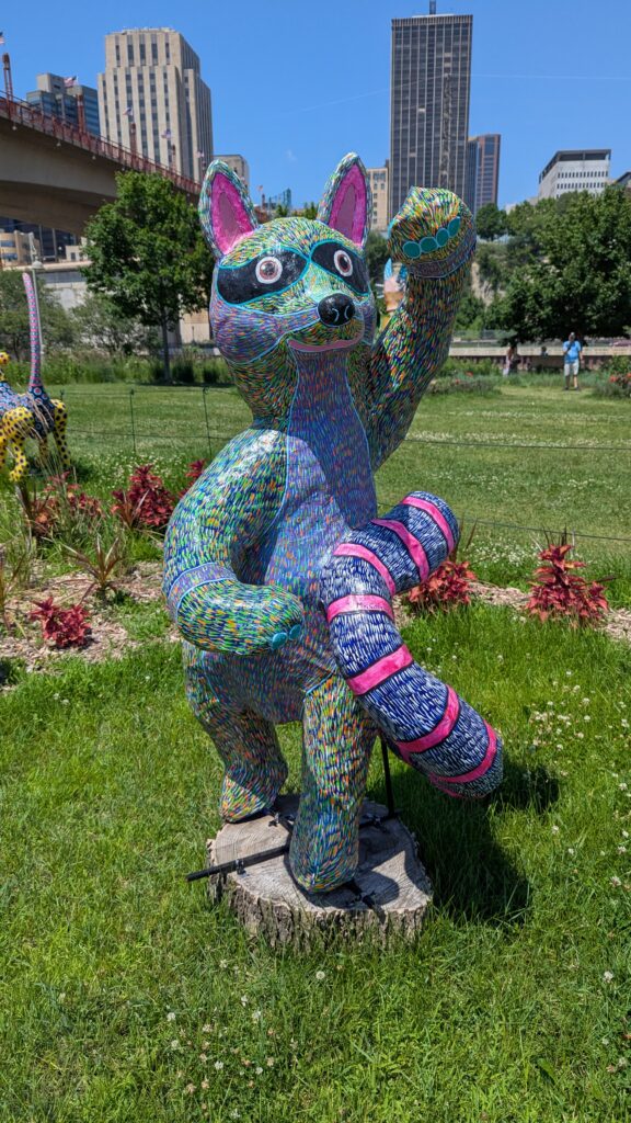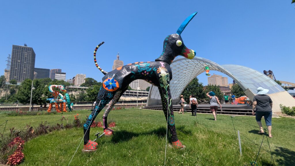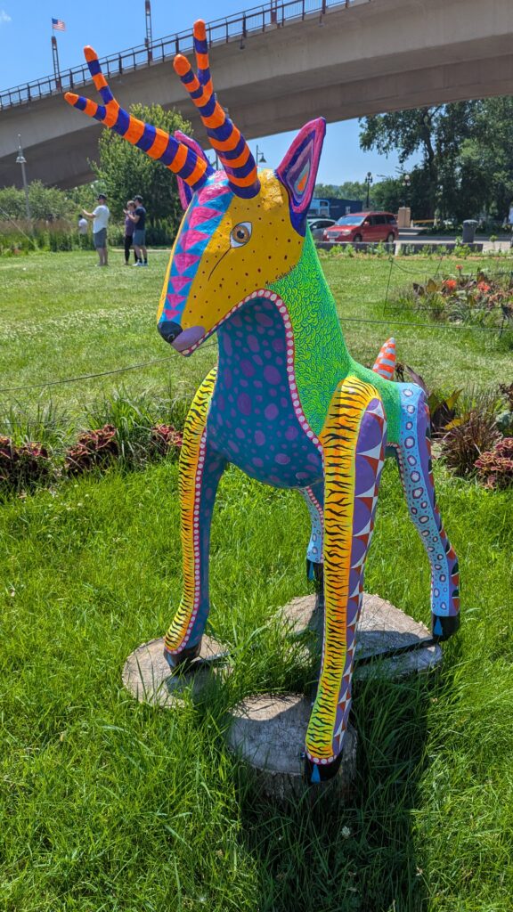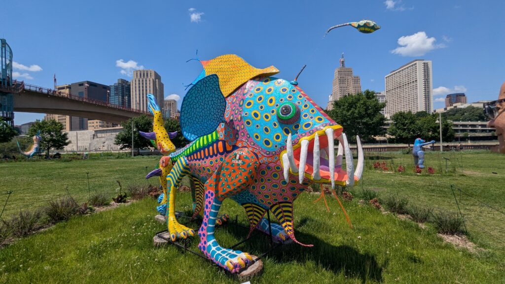 After talking about it for two days, Donna, Michael, Keith, and I went to Raspberry Island in St. Paul to see the art installation for the summer of paper mâché alebrijes – fantastical mixed up animal spirit guides. Donna wasn’t so sure about it all, because she does not like that dog from Coco. I assured her I did not like the dog either, so it would be fine.
