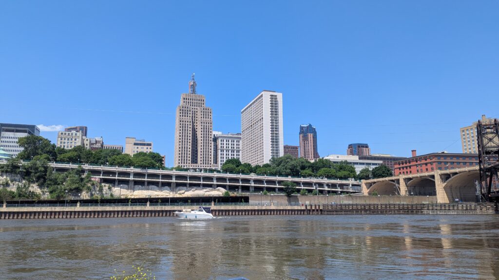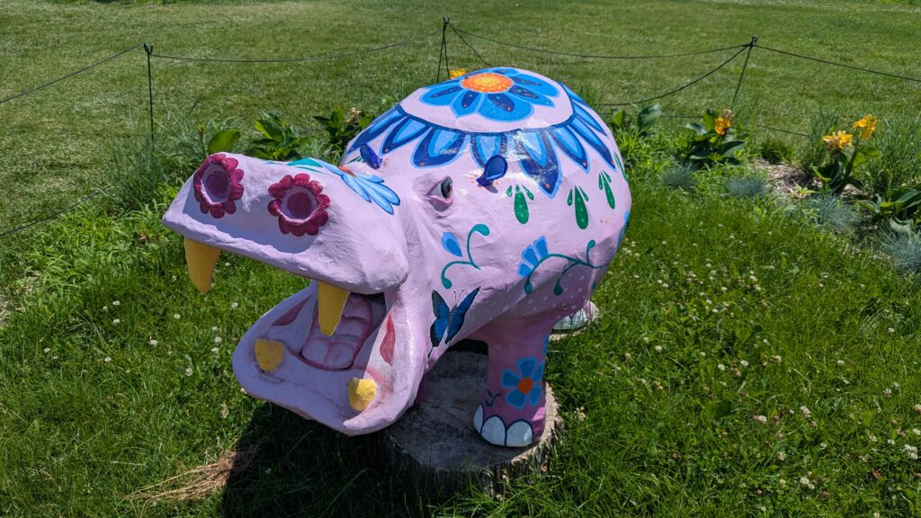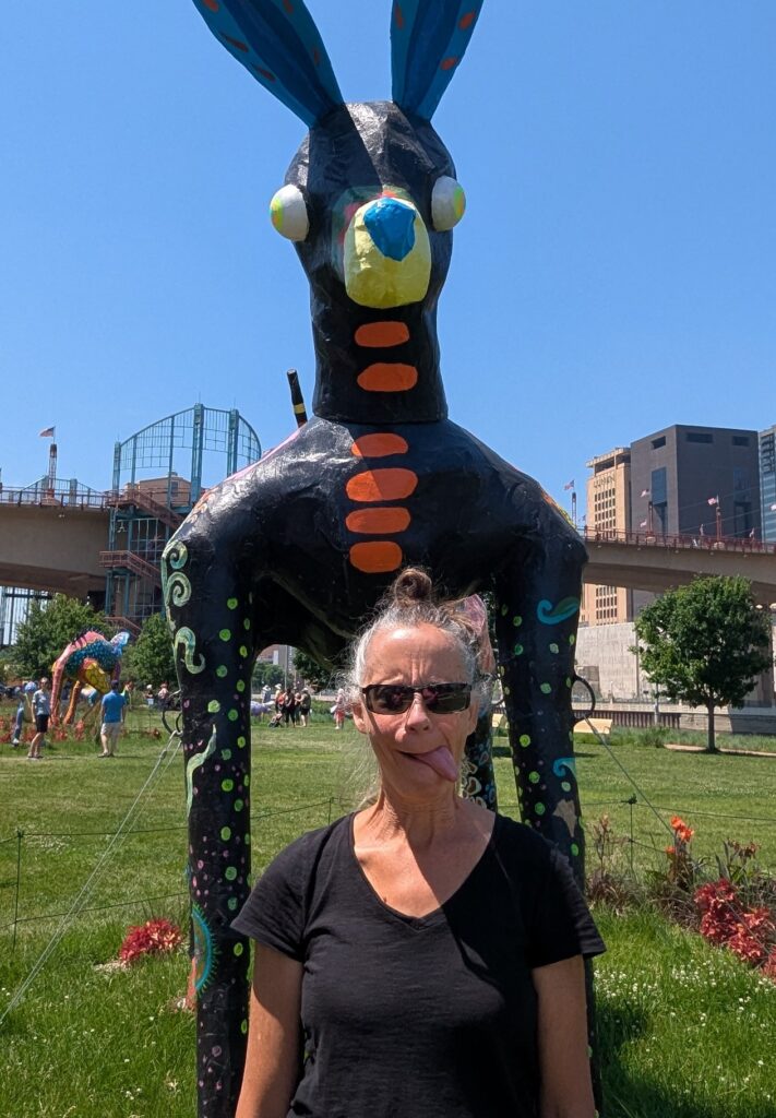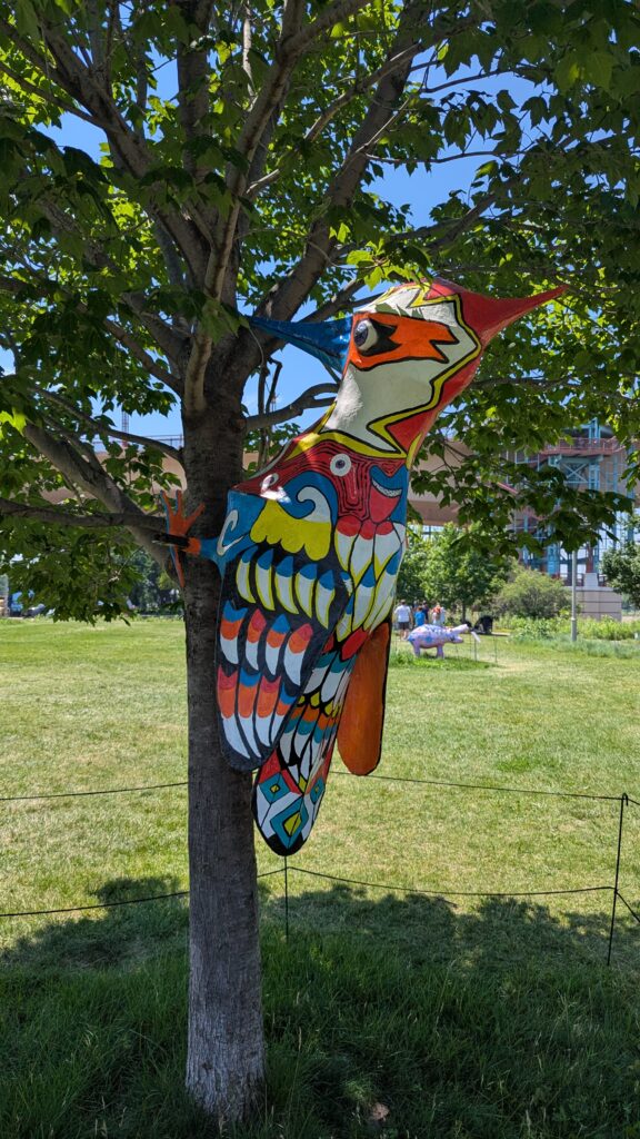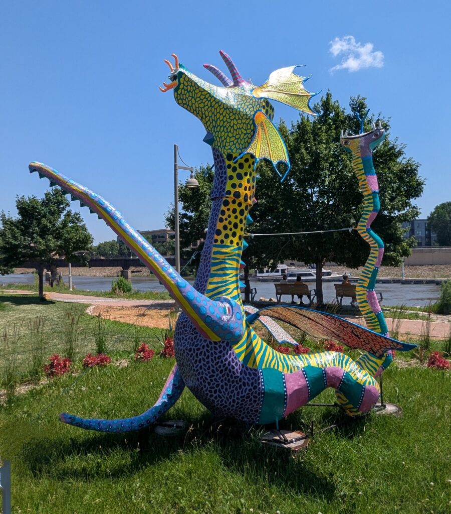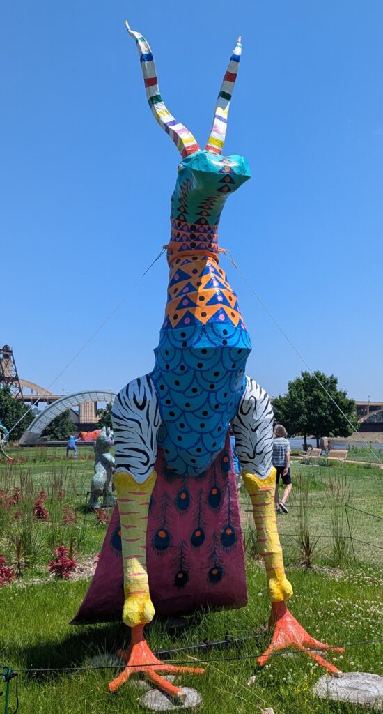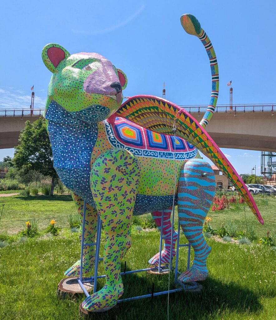 After talking about it for two days, Donna, Michael, Keith, and I went to Raspberry Island in St. Paul to see the art installation for the summer of paper mâché alebrijes – fantastical mixed up animal spirit guides. Donna wasn’t so sure about it all, because she does not like that dog from Coco. I assured her I did not like the dog either, so it would be fine.
