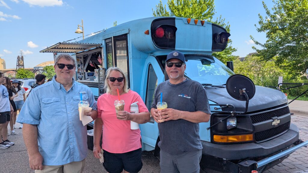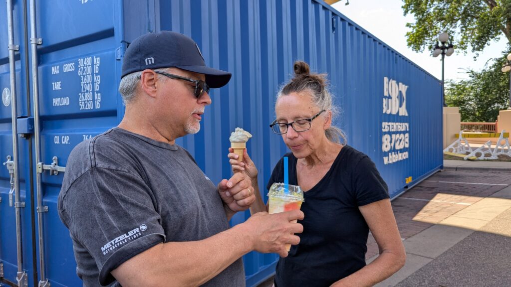 We had ice cream – peachy keen cone for Donna, the men had the Gilligan’s Island (vanilla ice cream, pineapple soda, coconut cream) and I had the Dash (Dr. Pepper float). A beautiful hot day was made better by a cold treat.