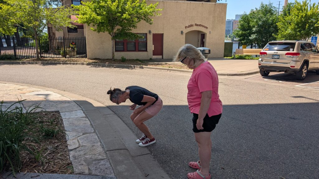 I tried really hard to help. I held her hand and jumped. Nothing. I held two hands and jumped. Nothing. At one point, while I was on the grass and she was standing on the edge of the road trying to jump up the curb, I suggested she try sideways. I thought maybe if she wasn’t looking at the mountainous obstacle (a curb), she could sneak up and jump. She lines up perpendicular to the curb, then looked at me with squinted eyes and said, “You come down here and think about that. That is impossible.” I went down and thought about. I lined up perpendicularly and jumped up onto the grass.