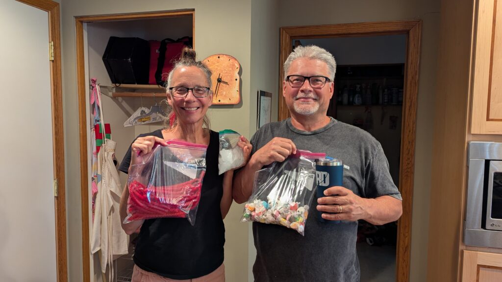 Packed with candy (and ice for the owie spot Donna keeps biting on her inside lip) and ready to roll.